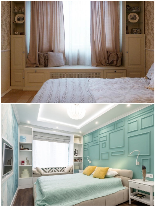Под окном можно сделать диванчик или лавку с выдвижными ящиками или полками. | Фото: berkem.ru/ design-homes.ru.Важно: В стремлении сэкономить побольше места многие устанавливают громоздкие и максимально вместительные шкафы, но этого делать не стоит если комната совсем крошечная. Чтобы визуально уменьшить массив мебели, ее лучше подбирать в тон стенам и отдавать предпочтение лаконичным и изящным шкафчикам.При оформлении спальни как и любой другой комнаты надо помнить, что не стоит бездумно гонятся за модой, ведь некоторые ее тренды так скоротечны, а жить придется с ними не один год.