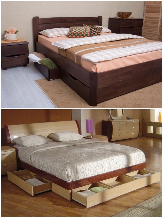 Подкроватные ящики всегда помогут спрятать вещи в спальне. | Фото: mebelnuy.com.ua/ planimetria.com.ua.Если замена мебели не входит в ваши планы и приходится довольствоваться тем что есть, то можно найти выход из положения самостоятельно. Обладателям кровати на ножках ничего сверхъестественного придумывать не надо, достаточно будет сделать ящики, которые поместятся под кровать.