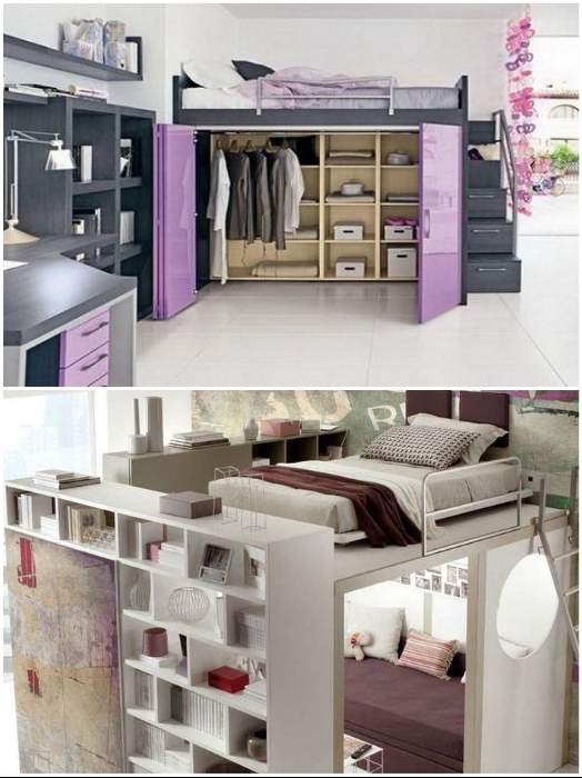Если есть возможность устроить спальное место на втором ярусе, то площади для передвижения и хранения значительно прибавится. | Фото: pinterest.com/ kvartblog.ru.Исключения составляют вторые ярусы, когда высота позволяет и нужно освободить напольное пространство. Как правило, такие площадки делают самостоятельно или приглашают мастера, поэтому есть все шансы спроектировать то количество и глубину ящиков, полок и шкафов, которых не хватает для хранения вещей вашей семьи.
