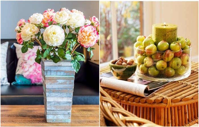 Искусственные цветы и фрукты не подходят для оформления интерьераМуляжи фруктов и искусственные цветы вызывают стойкую любовь не только экзотериков, приверженцев фэншуй, но и у дизайнеров. Несмотря на то, что современный рынок предлагает очень красивые варианты, которые не отличишь от настоящих, все же, как не крути – это мертвая энергия. Гораздо лучше украшать квартиру живыми комнатными растениями в стильных кашпо. Они добавляют комнатам уюта, легкости, свежести и плюс очищают воздух, что немаловажно. Что касается фруктов, то здесь дизайнеры также советуют отдавать предпочтение съедобным экземплярам. Если вам так хочется, чтобы они были на виду и выглядели эстетично, купите красивое блюдо и выбирайте в магазине большие яблоки, как в сказке про Белоснежку. Они будут прекрасно смотреться на кухонном столе.