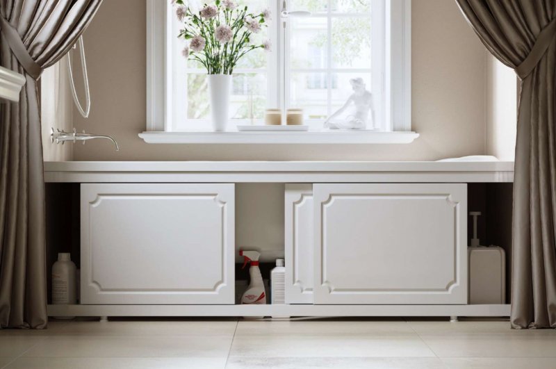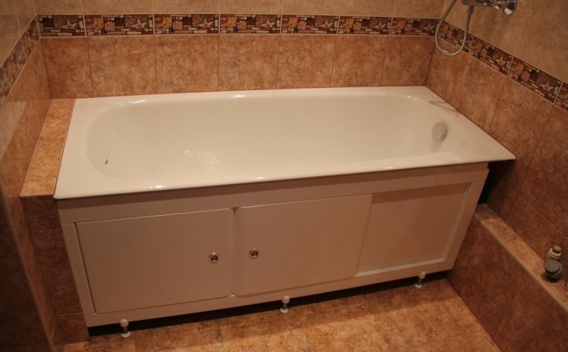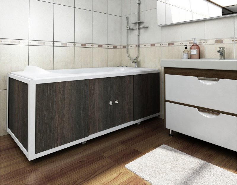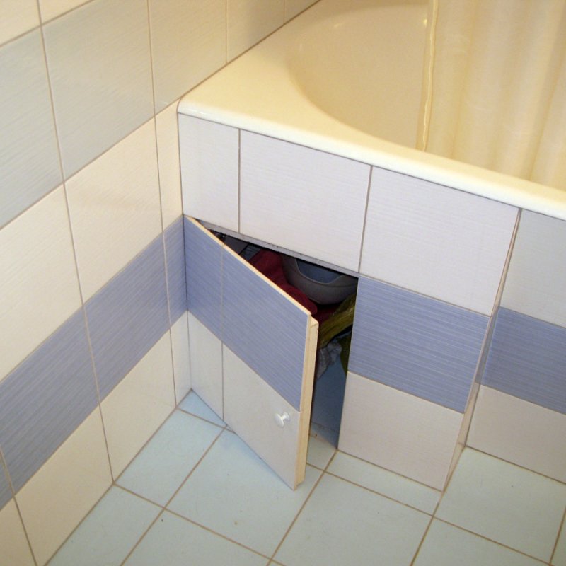 Это улучшенная версия сплошного экрана. В панели могут быть 1-2 дверцы, которые обеспечивают легкий доступ к трубам и хранящейся под ванной бытовой химии. Используются как съемные дверцы, так и оснащенные петлями – вторые гораздо удобнее. За дверцами можно оборудовать стойки с полочками, к панелям можно прикрепить пластиковые органайзеры для хранения мелочей.
