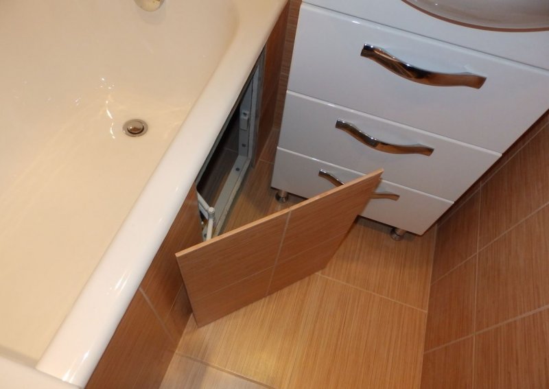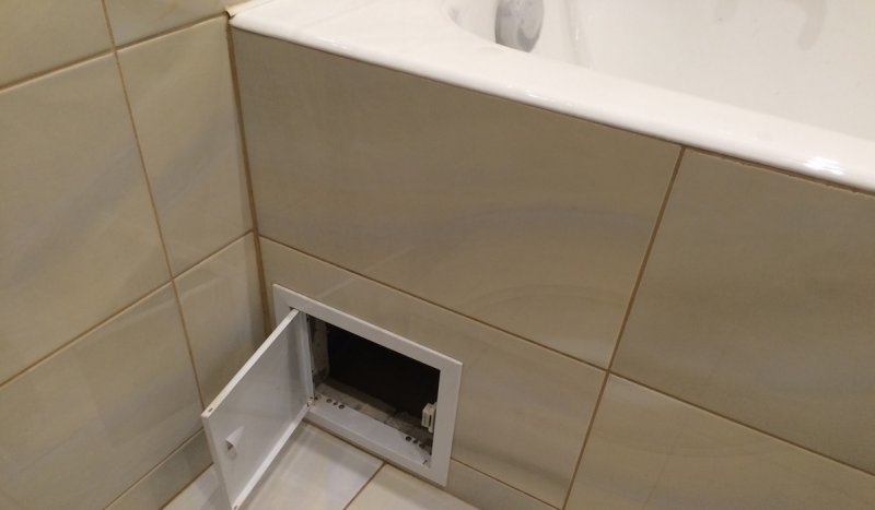 В конструкции экрана для ванны непременно должен присутствовать открывающийся или съемный люк, который обеспечивает доступ к коммуникациям.