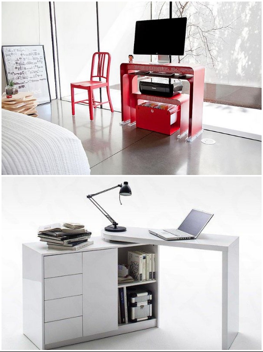 Тумба-трансформер поможет организовать комфортное рабочее место. | Фото: cpykami.ru/ festima.ru.Довольно удобным вариантом может стать тумба-трансформер, которую можно разобрать/раздвинуть во время работы. В остальное же время она будет служить современным предметом мебели для хранения книг или подставкой под телевизор.