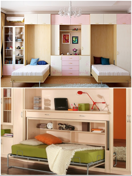Имея такую мебель, парочке влюбленных заранее нужно согласовывать график работы, приема пищи и сна. | Фото: mblx.ru.А вот если проживает хотя бы двое людей под одной крышей, то некоторые варианты действительно могут иметь существенные недостатки. Особенно это касается зоны отдыха и работы. Очень часто можно увидеть прекрасные компактные модели многофункционального шкафа, в который спрятаны кровать и рабочий стол. Если такой мебелью пользуется одинокий человек все получается довольно логично: когда ты спишь – стол совсем не нужен и наоборот.