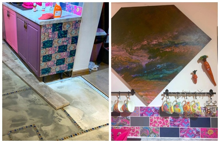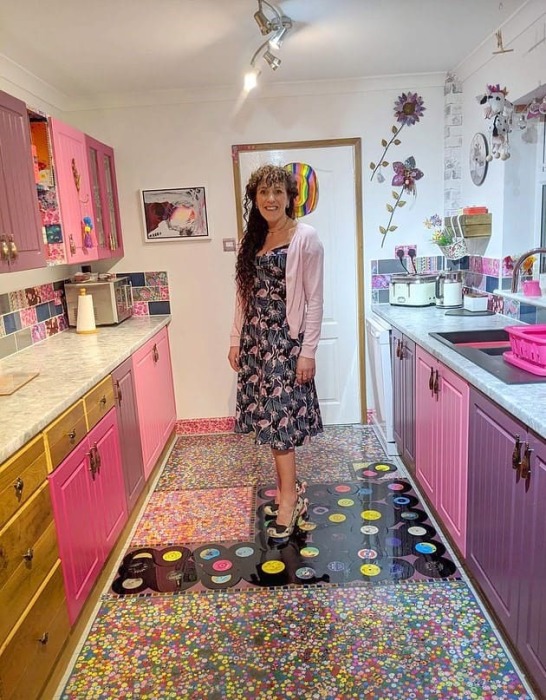 До чего только не додумается обманутая женщина, готовя месть мужу-изменнику. Но всех перещеголяла британка, которая умудрилась сделать так, что ежедневно, заходя на свою кухню, от души радуется тому, как эффектно и незабываемо отомстила экс-супругу. Дело в том, что ей пришло в голову украсить .пол его уникальной коллекцией пластинок. Будучи по натуре творческим человеком она создала оригинальную мозаику из коллекционных пластинок, ярких пуговиц-цветов, монеток и просто залила всю эту красоту эпоксидной смолой. Соня Бартон решила отомстить мужу-изменнику и замуровала его любимую коллекцию пластинок в напольное покрытие. | Фото: реbigpicture.ru.Творческая натура британки Сони Бартон (Sonia Barton) из Белпера, что в графстве Дербишир, придумала довольно эксцентричную месть для мужа-изменника. Чтобы хоть как-то развеяться и утешиться сразу после развода, мать троих детей решила сделать ремонт в ненавистной черно-белой кухне. Она довольно жизнерадостный человек, который любит яркие цвета и разнообразие, поэтому и постаралась сделать дизайн кухни под стать своему видению мира. Для начала нужно было избавиться от черной напольной плитки. | Фото: izmailvechernii.com.ua.Походы по магазинам так ничего и не дали, поэтому она решилась на самостоятельное создание как фасадов на кухонных шкафах и тумбах, так и напольного покрытия. Решение пришло само собой, когда женщина вспомнила о том, что муж, уходя из ее дома, не потрудился забрать свою коллекцию виниловых пластинок, которую с трепетом собирал. Он ее не только хранил, но и отчаянно оберегал от всех попыток супруги их пристроить в качестве украшения дома. Вот тут-то и созрела идея уложить эти пластинки .на пол, чтобы ежедневно наслаждаться плодами своего творчества и получать удовлетворение от того, что удалось так утонченно отомстить. Соня Бартон собственноручно перекрасила дверцы в любимый цвет, разрисовала кафель и сделал декупаж на торцах гарнитура. | Фото: storytrender.com.Для начала она сняла старый кафель и на полу, и на стенах, потом перекрасила дверцы кухонного гарнитура в свои любимые цвета – розовый и фиолетовый. На торцах сделала мозаику из лоскутов яркой ткани в технике декупаж.Справка: Декупаж — техника декорирования предметов с помощью нанесения рисунка, картин или орнамента, сделанного на ткани, бумажной салфетке или любом другом материале. Как правило, полученный результат после высыхания клея/краски вскрывают лаком или эпоксидной смолой, чтобы на дольше сохранить рисунок и придать композиции особенный визуальный эффект. Вот так преобразился кухонный гарнитур и стены после усилий Сони Бартон. | Фото: storytrender.com.Поскольку кафель для рабочей зоны Соня так подобрать и не смогла, она купила обычную белую плитку, разрисовала ее акриловыми красками и вскрыла эпоксидной смолой. Когда этот шедевр высох, креативная дама облицевала теперь уже разноцветным кафелем стены кухни. По сведениям редакции Novate.Ru, новую столешницу под мрамор она приобрела по сносной цене на платформе eBay, а вот установить ее помог друг. Это единственное, что женщина не смогла сделать сама. Всем остальным обустройством она занималась вечерами после работы и по выходным. Креативная женщина решила сделать каждую секцию пола с различным рисунком. | Фото: storytrender.com.Больше всего времени заняла укладка пола. Учитывая, что Соня противница од