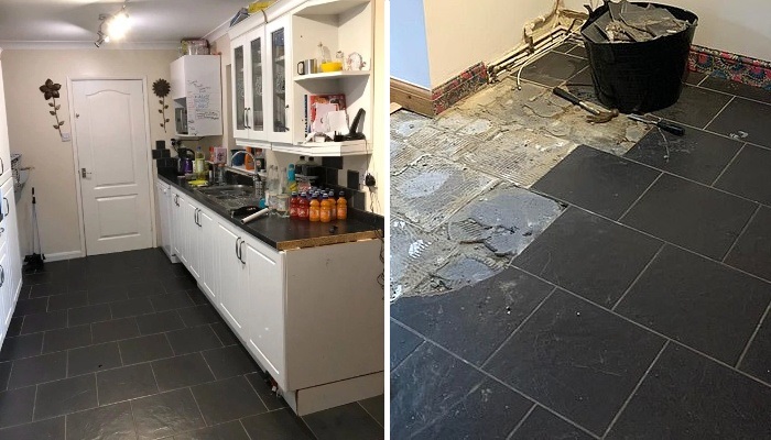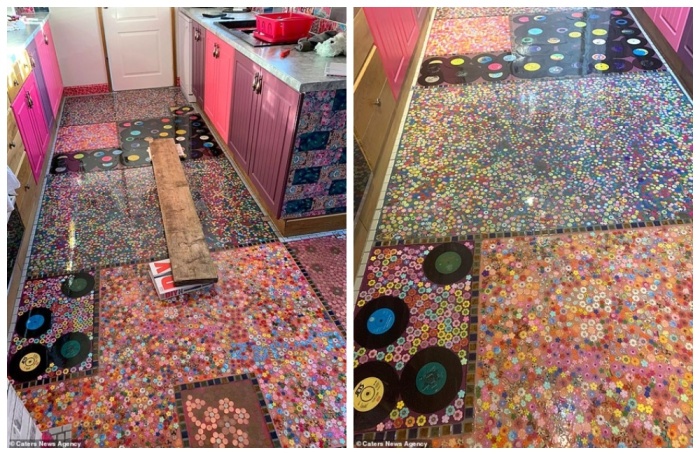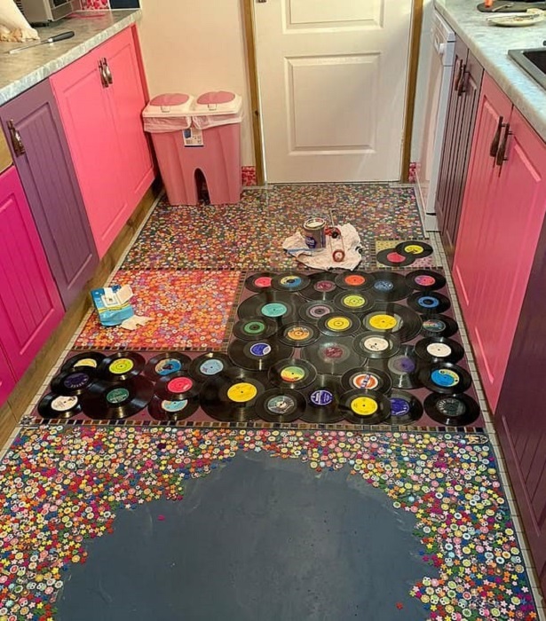 Соня Бартон решила отомстить мужу-изменнику и замуровала его любимую коллекцию пластинок в напольное покрытие. | Фото: реbigpicture.ru.Творческая натура британки Сони Бартон (Sonia Barton) из Белпера, что в графстве Дербишир, придумала довольно эксцентричную месть для мужа-изменника. Чтобы хоть как-то развеяться и утешиться сразу после развода, мать троих детей решила сделать ремонт в ненавистной черно-белой кухне. Она довольно жизнерадостный человек, который любит яркие цвета и разнообразие, поэтому и постаралась сделать дизайн кухни под стать своему видению мира.