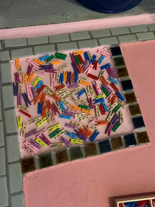 Разноцветные прищепки тоже могут вдохновить на создание необычной композиции. | Фото: storytrender.com.А один квадрат был создан и вовсе из ярких бельевых прищепок. Каждый элемент необычной мозаики большая любительница хендмейда приклеивала на пол, а потом каждый квадрат заливала эпоксидной смолой. Такое разделение позволяло передвигаться по кухне, устраивая с помощью обычной доски и нескольких толстых книг импровизированный мостик.