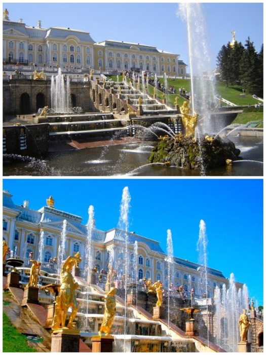 Самые знаменитые фонтаны дворцово-паркового ансамбля Петергоф (Санкт-Петербург, Россия). | Фото: sputnik8.com/ x-region.org.Большой каскад Петергофа является одним из самых крупных и восхитительных сооружений не только Санкт-Петербурга, но и всего мира. Действительно ни один фонтан не может сравниться с его роскошью, великолепием и объемом пропускаемой воды. Этот уникальный архитектурный комплекс, состоящий из трех частей, включает в себя 3 водопадные лестницы (длина 42 м) и 2 грота (Верхний и Нижний гроты), 75 фонтанов, 255 бронзовых статуй, маскаронов (лепной орнамент в виде маски или человеческого лица) и множества декоративных деталей. Несмотря на то, что водным конструкциям и скульптурным произведениям уже скоро исполнится 400 лет, его впечатляющие формы и габариты остаются самым значимым достижением инженерной мысли человечества.Более подробно об истории создания и нераскрытых тайнах Петергофа можно узнать из следующего материала.