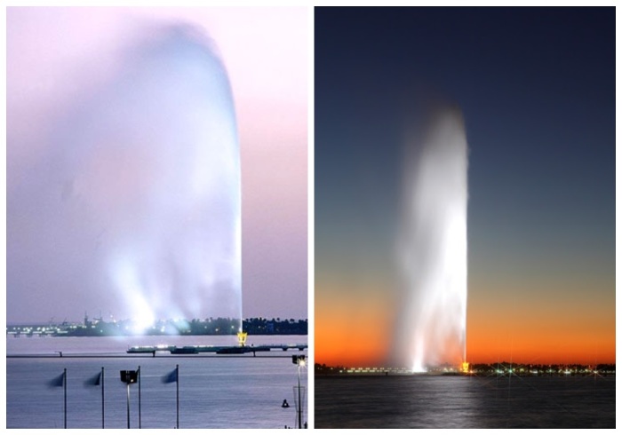 Величие в простоте (Фонтан короля Фахда, Саудовская Аравия). | Фото: cawater-info.net/ lightsup.ru.Довольно помпезное название фонтан получил в честь короля Саудовской Аравии Фахда ибн Абдель Азиз Аль Сауда, но чтобы не утомлять туристов, чаще всего его называют фонтан Джидды. Учитывая, что он посвящен столь высокопоставленной особе, инженеры постарались на славу, их многолетние усилия увенчались рекордом, который до сих пор не побит. Как ни странно это звучит, но фонтан, расположенный в море и открывшийся еще в 1985 г., все так же считается рекордсменом высоты – 312 метров. Учитывая сложность конструкции и месторасположение, не было странным, что его запустить сразу не удалось. Понадобилось еще 2 года, чтобы струя воды взметнулась в небо до такой заоблачной отметки. Пусть он и не является архитектурным шедевром, но характеристики впечатляют. Сложно даже представить, что фонтан может выбрасывать ввысь 652 л воды в секунду(!), при этом скорость «полета» составляет 375 км/ч.