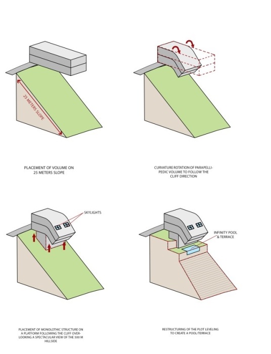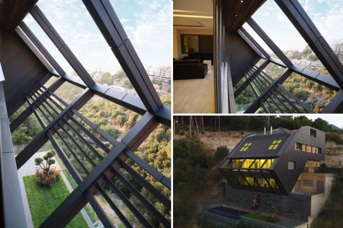 В небольшой деревне, расположенной у подножия «Белой горы» в Ливане, появилось необычное строение, удивляющее не только тем, что практически свисает с утеса, но и особенной конструкцией. В этом проекте архитекторы учли основные пожелания заказчика: гармоничное внедрение в ландшафт местности, современный дизайн, автономное существование и максимальная сохранность окружающей среды. Решая эти сверхзадачи, команда дизайнеров создала дом, полный умных решений и творческих идей. «Падающий» со скалы: ливанские архитекторы спроектировали роскошную виллу на краю утеса (CH730 Villa, Ливан). | Фото: e-architect.co.uk.На высоте 500 м над уровнем моря на одном из утесов горного хребта Ливана «Джебель Любнан» (Белая гора) появилось необычное строение, которое вызывает повышенный интерес не только у местных жителей. Если с южной стороны смотреть на CH730 Villa, так называется особняк, то ничего необычного не увидишь. Если подъехать со стороны деревеньки Чнанир, то дом выглядит вполне современно и стандартно (CH730 Villa, Chnaniir). | Фото: newatlas.com.Подъездная улица со стороны населенного пункта упирается в ворота вполне обычного дома с современной планировкой. Но с северной стороны, находясь в долине у подножия горного хребта подняв голову вверх, можно действительно ужаснуться, ведь часть дома свисает над пропастью. И возникает стойкое ощущение, что дом вот-вот упадет с края утеса. Если на виллу посмотреть со стороны, то кажется, что дом «сползает» по склону горы (CH730 Villa, Chnaniir).| Фото: e-architect.co.uk.Необычный проект разработала архитектурная компания Daz Architects для клиента, который пожелал иметь большой особняк на видовом участке неподалеку деревеньки Чнанир (Chnaniir). Перед командой дизайнеров клиент поставил довольно сложные задачи: гармоничное сочетание с окружающим пейзажем, причем не только природным, не изменять топографию первоначального ландшафта, максимально сохранить окружающую среду. Вид на дом с высоты птичьего полета (CH730 Villa, Chnaniir). | Фото: e-architect.co.uk.Работа специалистов архбюро усложнялась тем, что большой по объему участок (810 кв.м.) имел серьезный угол уклона. Одна его часть находилась на склоне, а в таком положении удержать объект довольно сложно, тем более, что клиент особенно возражал против радикального вмешательства в структуру самого утеса. Схема-чертеж конструкции CH730 Villa (Chnaniir, Ливан). | Фото: newatlas.com.В итоге было решено делать дом на монолитно-бетонной платформе, которая повторяла очертания скалы. Тем самым они выполнили одно из условий и обеспечили обитателей дома захватывающими видами и на склоны холма, и на горную гряду. Чтобы дом более органично вписывался в окружающий ландшафт и бетонный массив меньше выделял углекислого газа цокольную платформу, как и бетонные части этажей облицевали легкими композитными материалами и деревом. Дом возводился на многоступенчатой монолитно-бетонной платформе (CH730 Villa, Chnaniir). | Фото: newatlas.com.Интересно: Композитные материалы (КМ) – это многокомпонентные материалы, в состав которых входит пластичная основа и армированный наполнитель, которые обладают высокой прочностью и жесткостью. Современные возможности промышленности позволяют создавать композитные материалы, которые в разы прочнее стали, тверже титана и при этом они бывают легче алюминия, что не влияет на их уникальные механические и тепловые свойства. КМ по праву сч