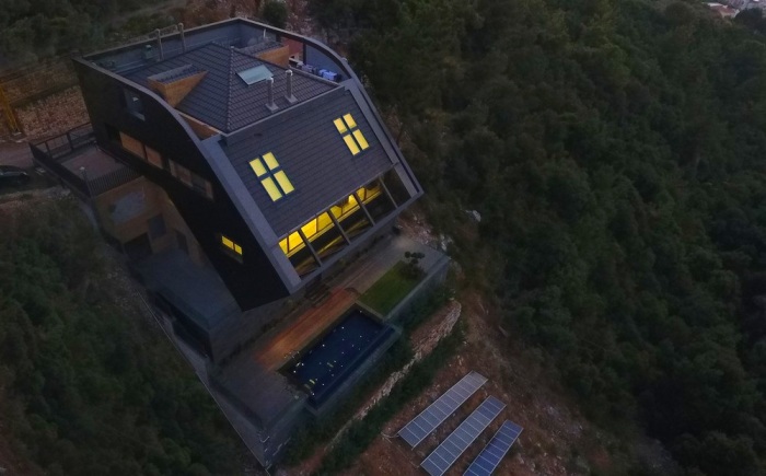Чтобы не занимать площадь крыши, солнечные батареи поместили на склоне утеса ниже самого дома (CH730 Villa, Chnaniir). | Фото: newatlas.com.По сведениям редакции Novate.Ru, чтобы сделать виллу самодостаточным объектом независящим от центральных коммуникаций, помимо дизельных генераторов установили солнечные батареи. Также внедрили системы хранения и переработки дождевой и сточной воды.