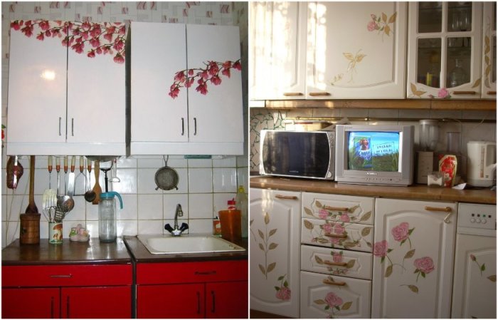Декупаж - отличный вариант украшения гарнитураЕсли капитальный ремонт делался давно, скорее всего гарнитур уже потерял свой презентабельный внешний вид. Прежде, чем окончательно решить его судьбу, приведите все дверцы, шкафчики и тумбочки в порядок. Далее возможна масса вариантов: декупаж, покраска акрилом, оклеивание поверхности небольшими кафельными плитками или мозаикой. Не забывайте про замену фурнитуры – новые красивые ручки моментально преобразят внешний вид гарнитура. Главное – не подбирать слишком вычурные варианты. Возможно, они и будут стильно смотреться, но вот их практичность вызывает сомнения.Обратите внимание: Очень часто консультанты в магазинах рекомендуют воспользоваться самоклеящейся пленкой. Однако, несмотря на ее низкую цену, качество оставляет желать лучшего. Основная проблема заключается в том, что ровно ее приклеить. Кроме того, на ней очень заметны морщинки, да и красоты гарнитуру пленка не добавит.