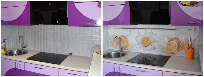 Фартук до и после ремонта. / Фото: glassna.ruБольше всего страдает во время готовки кухонный фартук, ведь он принимает на себя основной удар в виде жирных пятен, капель воды и прочих загрязнений. А еще он часто является акцентом в интерьере, на который в первую очередь обращают внимание. Иногда достаточно заменить советский кафель на что-то модное, и кухня мгновенно преображается. Полностью удалять плитку совсем необязательно. Можно купить в строительном магазине стеклянные панели (скинали) и приклеить прямо поверх фартука. Ассортимент материала очень большой, поэтому вы без труда сможете подобрать экземпляр с нужным рисунком. Крепятся такие панели на клей либо на шурупы.