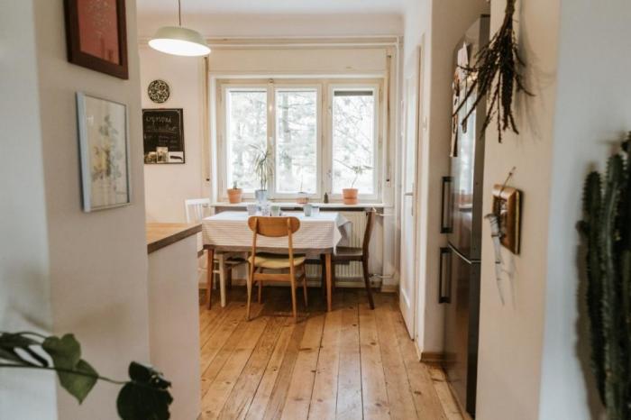 Обеденный стол и стулья оставили от прежних хозяев. | Фото: instagram.com/ © hudalukna.Обеденную зону решили сделать у окна, которое тоже пришлось приводить в порядок. На металлопластиковые рамы его не стали менять, потому что молодым людям хотелось больше натуральности, также они оставили старый стол и стулья. Поскольку старая мебель была достаточно добротная, руки не поднялись ее выбросить на помойку. Конечно же их отмыли, где надо подкрасили или вскрыли лаком и организовали прекрасный обеденный уголок.