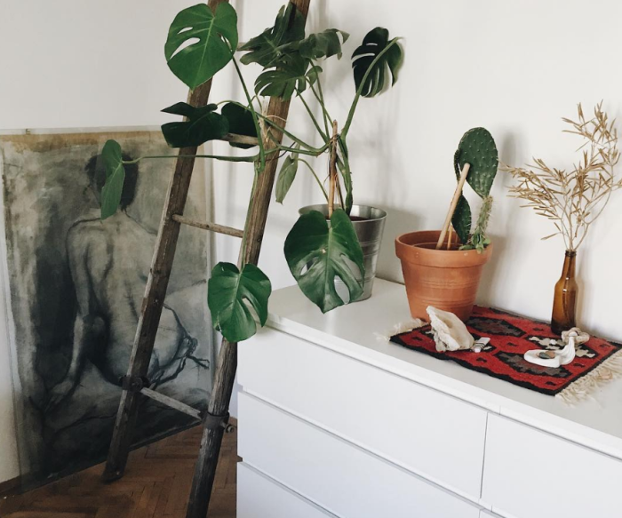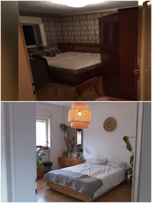 От спального гарнитура оставили только тумбу, которую тоже покрасили в белый цвет. | Фото: instagram.com/ © hudalukna.В основном молодые супруги не тратились на приобретение современной мебели. Они постарались привести в порядок ту что осталась от прежних хозяев. Некоторые предметы почистили и вскрыли лаком, другие покрасили в белый или черный цвет, а то, что совсем не вписывалось в обновленный интерьер выбросили, чтобы не загромождать пространство.