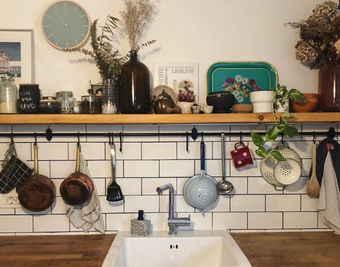 Угрюмые навесные шкафы заменили одной открытой полкой из массива натурального дерева. | Фото: instagram.com/ © hudalukna.С последним вопросом пришлось обращаться к специалистам, хотя со всем остальным прекрасно справлялись сами, правда иногда ребятам помогали друзья и родители. Несмотря на довольно тяжелый график жизни: работа-ремонт-работа у ребят был такой творческий подъем, что когда на работе они обнаруживали раствор или краску в волосах, не очень-то расстраивались, а спешили снова домой и брались за дело.