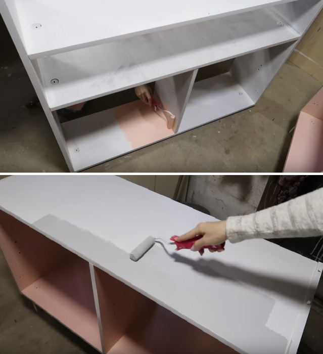 Для покраски деревянных поверхностей лучше использовать специальные валики. | Фото: youtube.com/© Bubenitta.Поскольку секретер предназначается для дочери Надежды девушки, решили, что внутренняя часть будет нежно персикового цвета, а фасады, просвет и торцы – бледно-серого. Чтобы краска смотрелась более плотной и однородной, нужно вскрывать в 2-3 слоя, при этом каждому слою необходимо дать время на полное высыхание.