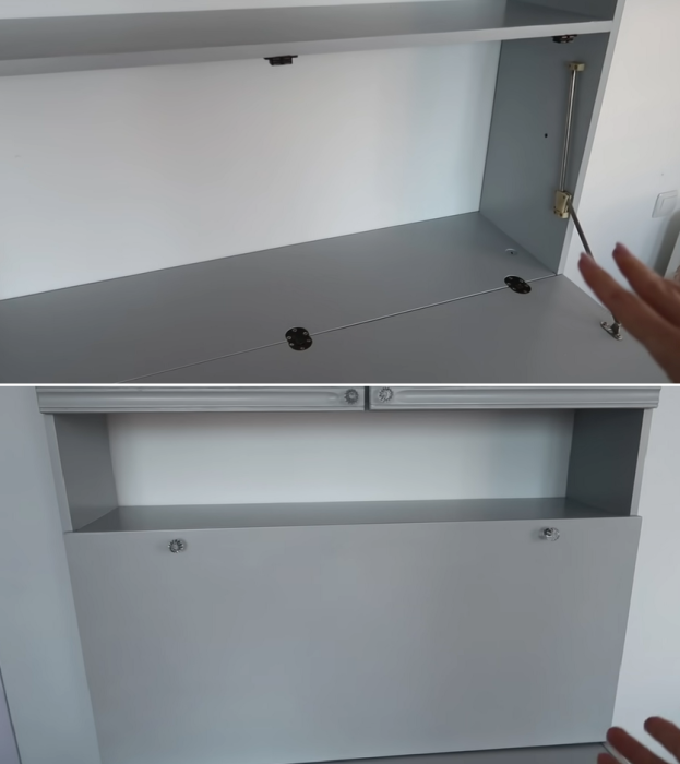 Процесс сборки и регулировки снятых деталей секретера. | Фото: youtube.com/© Bubenitta.После того, как высохли все поверхности, можно приступать к сборке. Все детали и механизмы, которые приобрели для замены или оставили старые, нужно установить на место и отрегулировать открывающие элементы.