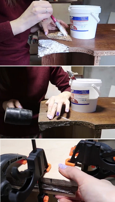 Этапы реставрации отломанного угла боковой части секретера. | Фото: youtube.com/© Bubenitta.В том случае, если есть повреждения или сильные сколы и отломанные части сохранились, то их можно приклеить на место. Для этого понадобится строительный клей ПВА, который отличается повышенной клейкостью и густотой (от канцелярского). После того как тщательно очистили поврежденные половинки от пыли и мусора, нужно хорошенько промазать все образовавшиеся трещины и поверхности. Чтобы обломанная часть более плотно вошла на старое место, лучше постучать по краям киянкой. Затем взять две небольших ровных дощечки, приложить из с двух сторон отреставрированного угла и зажать струбцинами. В таком положении оставить до полного высыхания.