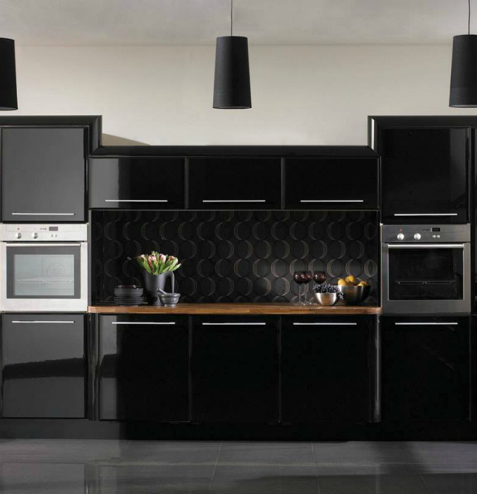 Темный глянцевый гарнитур на кухне. | Фото: ModernPlace.ru.Покупать темный глянцевый гарнитур стоит только в том случае, если вы готовы стать рабом уборки или, если можете закрыть глаза на все и принять мысль, что такой глянцевой и блестящей, как в первые недели она больше не будет никогда. Нет, мы согласны, темные глянцевые фасады выглядят роскошно, но они совершенно не пригодны для обычной жизни. Только представьте, каждое ваше прикосновение останется отпечатком на дверце, брызги жира превратятся в белые подтеки, а капли воды - в мутные разводы. А еще вы воочию сможете увидеть, как быстро в вашей квартире появляется пыль, а она, уж поверьте, появляется очень быстро.
