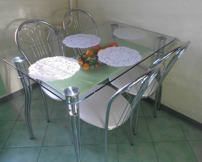 Стеклянный стол на кухне. | Фото: Яндекс.Стеклянная мебель, безусловно, красива, кроме того, она выглядит намного легче, чем предметы из других материалов. Но стеклянный стол на кухне - далеко не самая практичная идея. Во-первых, стеклянную поверхность легко повредить: царапины от ножа, сколы от ударов тяжелой посуды, мелкие потертости и так далее. Во-вторых, пятна на стекле намного заметнее, а от мокрой тряпки всегда остаются разводы. И напоследок, известны случаи, когда столешница трескалась от контакта с горячей посудой, несмотря на то, что материал закаленный.