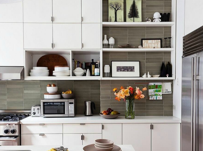 Открытые полки на кухне. | Фото: YellowHome.ru.Открытые полки и все, что на них, выглядит как украшение интерьера. Кроме того, они добавляют интерьеру изящества и легкости. Но кроме красоты вы получите и дополнительные хлопоты, связанные с уборкой. Дело в том, что все открытые поверхности необходимо ежедневно мыть, иначе уже через 3 дня они покроются малопривлекательной смесью пыли и жира.