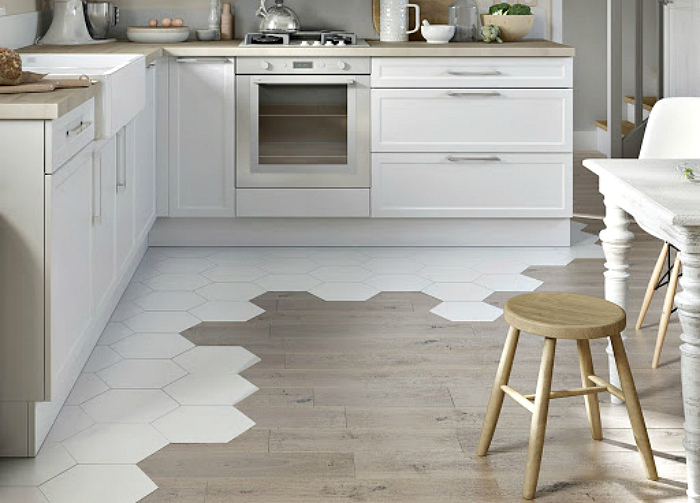 Плитка и ламинат на кухне. | Фото: zhil.msk.ru.Сочетание плитки и ламината на кухне выглядит очень стильно, но, к сожалению, только на картинках. На деле между плиткой и досками всегда остается небольшой зазор, который со временем заполнится мусором и жиром. Решением проблемы может стать небольшой порожек, но об него вы будете постоянно спотыкаться.