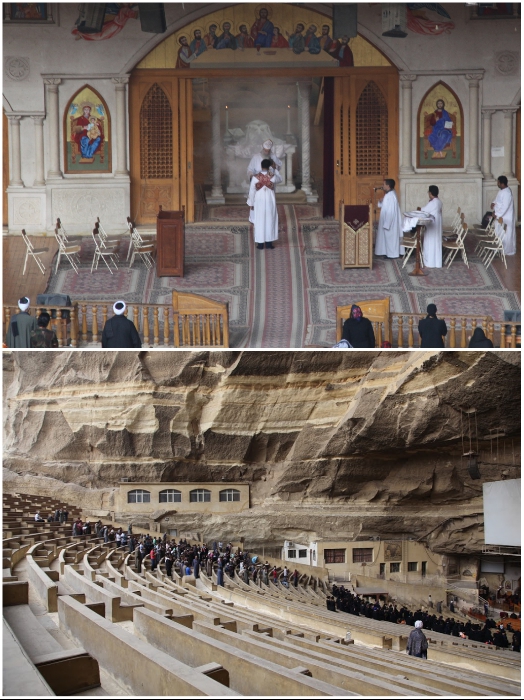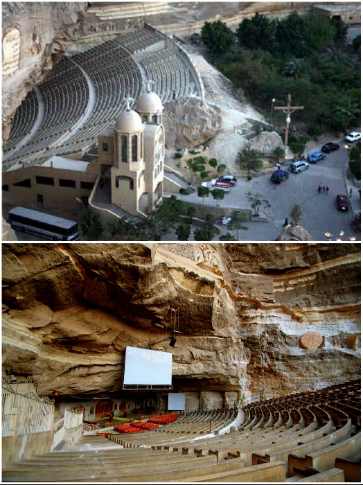Амфитеатр основной церкви занимает площадь более 1 тыс. кв. м. (храм Св. Симеона, Каир). | Фото: wikimapia.org/ omyworld.ru.За эти годы город разросся и в нем уже проживает около 30 тыс. человек, ведь этим людям разрешено поселяться в нем официально, хотя он больше похож на свалку нежели на населенный пункт. Улицы и первые этажи завалены горами мусора, который издает зловонный запах, но стоит только покинуть пределы последнего квартала, перед входом открывается удивительная красота пещерного комплекса Мукаттама. Его стены и отроги украшены огромными барельефами и скульптурами на библейские сюжеты, которые создал польский священник Мариуш, живущий в Каире.