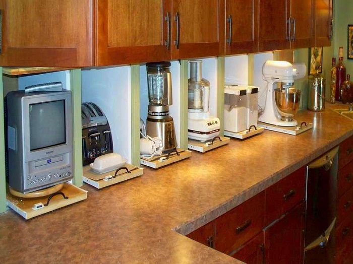Не вся техника нужна на кухне. / Фото: In.pinterest.comЭтому вопросу нужно уделить максимально пристальное внимание, ведь будет обидно, если вы потратите огромные суммы на покупку бытовой техники, а потом не будете ею пользоваться. Например, кофеварка, блендер, тостер, аэрогриль нужны далеко не всем, а вот без холодильника и микроволновки обойтись сложно.Перед тем, как покупать технику, необходимо определиться с планировкой. В этом случае вам легче будет понять, какие коммуникации необходимы, и где их лучше провести. Чтобы сэкономить место на кухне и обеспечить удобное рабочее пространство, покупайте встраиваемые приборы. Так вы сможете организовать имеющееся пространство максимально эффективно.