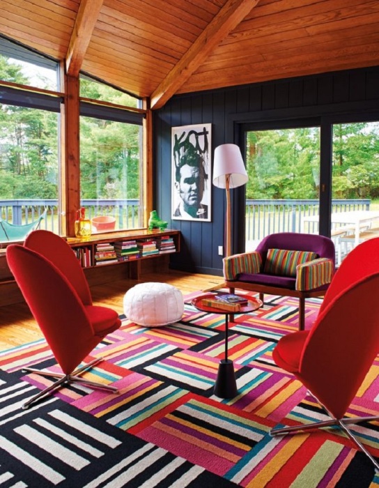 Яркие цвета и геометрические принты - основа поп-арта. / Фото: InMyRoom.ruПервое, что приходит на ум при упоминании стиля поп-арт – бурные 60-е, постеры на стенах с изображение Мерилин Монро, четкие геометрические формы, большое количество глянца и пластика, оригинальные фактуры, декор из консервных банок. Этот стиль видит в каждой привычной нам вещи произведение искусства.Каждый предмет такого интерьера должен быть ярким, интересным, запоминающимся: например, желтое кресло, монохромный красный ковер, белый стол из пластика. Что касается подушек, то стоит выбирать однотонные варианты, возможно, кислотных оттенков.Основными материалами интерьера в стиле поп-арт являются пластик, полированные дерево, одноцветные ткани. Стены должны стать фоном для различных акцентов в виде постеров, фотографий, поэтому их лучше красить в белый или холодный серый оттенок. Не менее органично будут смотреться принты – горох, полосы, геометрические фигуры.А варианты осветительных приборов для веранды вы найдете в статье 15 заманчивых идей освещения дачного участка и сада