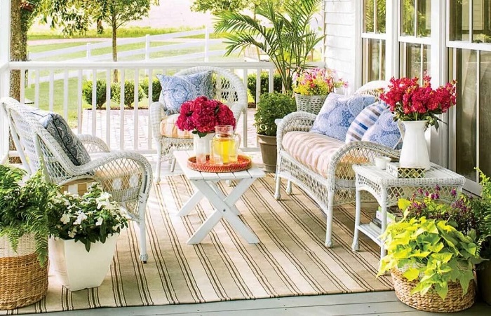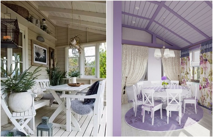 Прованс - нежный, светлый и романтичный стиль. / Фото: Zen.yandex.ruЭтот стиль больше всего подойдет для маленького пространства, так как он не требует огромного количества массивной мебели. Прованс позволит создать на веранде уютную атмосферу южного региона Франции с теплым морским бризом и ароматом свежей выпечки.Основным цветом прованса является белый. Его можно охарактеризовать несколькими словами: нежный, светлый, романтичный. Здесь нет места скупому минимализму – французский стиль предполагает наличие большого количества деталей и аксессуаров. Так, для оформления веранды идеально подойдут белоснежные горшки из глины, миниатюрные керамические вещицы, кашпо с изображением лаванды – символа Прованса, который знаменит на весь мир своими лавандовыми полями.Совет: Если на веранде осталось место, обязательно позаботьтесь об этажерках и удобных полочках – на них прекрасно будут смотреться книги, любимая посуда в светлых тонах, бокалы и пр.Одной из главных особенностей прованса являются деревянные поверхности. К счастью, при создании большинства веранд используют именно этот натуральный материал. Все, что вам останется – выкрасить пол в белый цвет, создав искусственные элементы потертости. Альтернативный вариант – бело-серая плитка, аналогичная по фактуре. Она является более прочной и устойчивой к внешним негативным факторам, а также позволяет создать впечатление домашнего уюта. Отличным дополнением интерьера станут ковры – лучше отдавать предпочтение текстилю светлого, нежного оттенка, например, пудровому, бежевому, кофейному и пр.