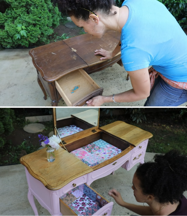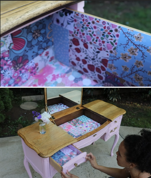 Оригинальное решения для преобразования внутренних поверхностей выдвижных ящиков туалетного столика. | Фото: youtube.com/ © Thrift Diving.Поскольку это все-таки туалетный столик и у него имеется откидное зеркало нужно было и его привести в порядок. Для этого нужно было откручивать петли и полностью снимать крышку и зеркало. Чтобы привести в порядок поверхности, пришлось повторить тот же процесс, что и с основной конструкцией стола. А вот внутреннюю часть ящиков новая владелица раритетного столика оклеила бумажными картинками, которые продаются в наборе для рукоделия.Благодаря своей страсти снимать видеоролики и стремлению делать многие вещи своими руками блогеры не только облагораживают свои интерьеры и реставрируют мебель, но помогают дилетантам. Как это делает еще одна очаровательная американка,