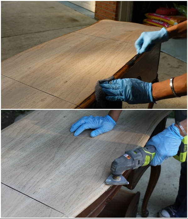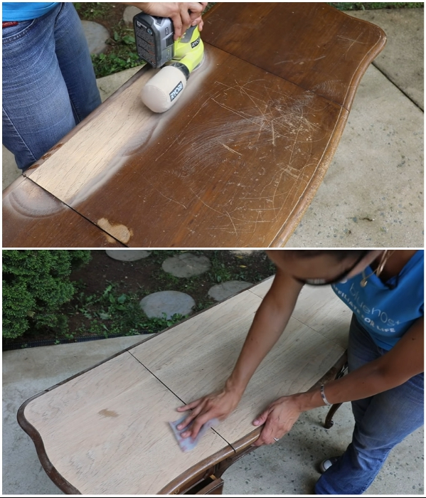 Для очистки поверхности стола можно использовать шлифовальную машину и наждачную бумаг. | Фото: youtube.com/ © Thrift Diving.Чтобы привести в порядок верхнюю часть стола, требовалась не только очистка поверхности, но и полноценное снятие верхнего покрытия. Учитывая глубину повреждений, Серена решила воспользоваться шлифовальной машиной с разной зернистостью съемных кругов. После кардинального снятия поврежденного покрытия пришлось поработать еще и наждачной бумагой.