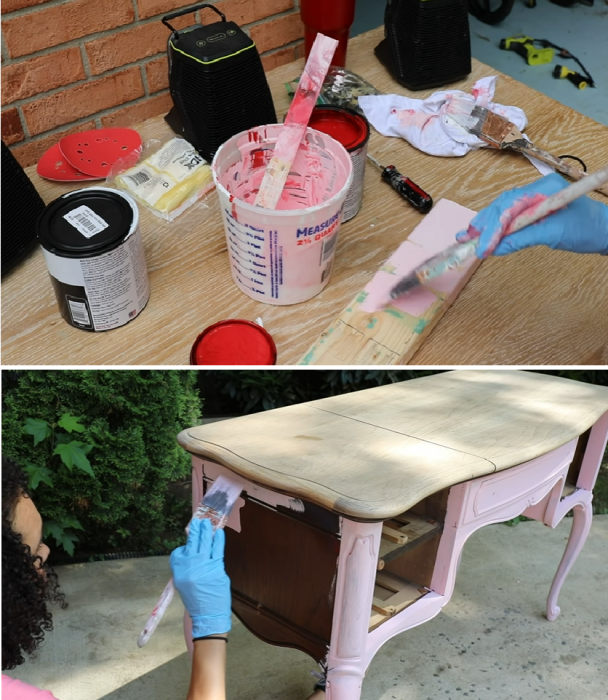 Процесс окрашивания основной части французского столика. | Фото: youtube.com/ © Thrift Diving.Поскольку новая владелица французского столика решила сделать его гламурным и покрасить в бледно-розовый цвет, пришлось смешивать несколько цветов краски, чтобы получить желаемый оттенок. Окрашивание Серена начала с нижних элементов, чтобы можно было откорректировать цвет, если его тон не понравится.