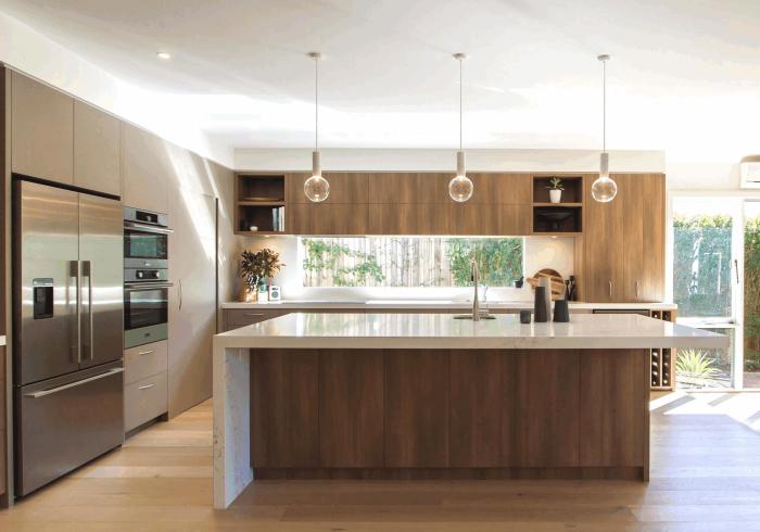 Современный стиль обычно подразумевает лаконичные фасады, но яркие формы. Например, глянцевый кухонный гарнитур, где часть шкафчиков интересного акцентного оттенка или яркий кухонный фартук. Такая кухня обычно смотрится предельно современно, а по стоимости ремонт стоит даже меньше, чем эталонный скандинавский.В современном стиле часто можно встретить встроенную бытовую технику, и речь идет не только о духовом шкафе с плитой. Например, вы найдете здесь незаметный за однотонным фасадом холодильник, интегрированную кофе-машину, невидимую посудомоечную машину или даже дополнительные гаджеты: фритюрницу, гриль тепан-яки, wok-панель и т.п.