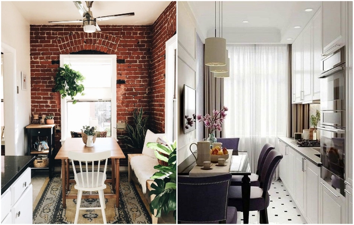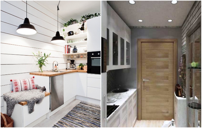 Даже узкую кухню можно сделать и уютной, и функциональной. | Фото: es.postila.io/ roomble.com.Тем, кому не повезло с маленькой кухней, дизайнеры советуются по максимуму избавиться от всего лишнего или найти место для хранения дополнительных комплектов столовых приборов в других комнатах. И только потом начинать скрупулезно, сантиметр за сантиметром, распределять самые необходимые оборудование, технику, мебель, кухонную утварь и посуду. Если все это удалось втиснуть в скромное пространство, остается лишь поддерживать чистоту.