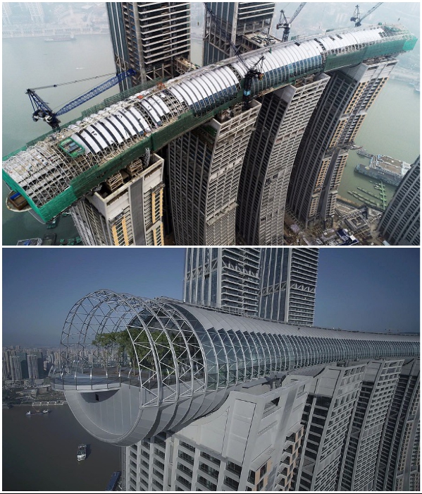 Занимательное путешествие на смотровую площадку начинается с первого этажа одного из 4 небоскребов-«атлантов» из комплекса Raffles City («Crystal», Китай). | Фото: youtube.com/ © CapitaLand.По сведениям редакции Novate.ru, самой большой сложностью при создании моста было поднятие на ошеломительную высоту некоторых частей конструкции, которые в сложенном виде составляют 12 тыс. тонн. Но как бы там ни было, трехсотметровое сооружение, созданное из стали и стекла, уже установлено на своем месте и полностью оборудовано для приема посетителей.