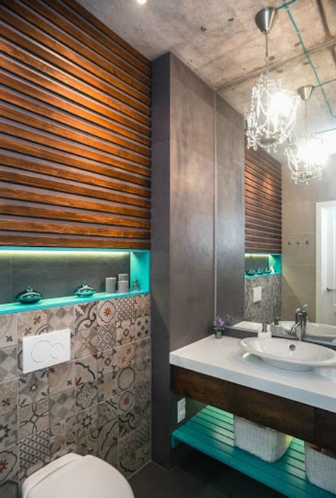Сочетание разных фактур в интерьере маленького санузла. | Фото: Лаборатория дизайна интерьера.Часто владельцы маленьких ванных комнат вообще не заморачиваются с интерьером, останавливаясь на самой простой керамической плитке. Однако не нужно преждевременно ставить крест на своем маленьком санузле. Дизайнеры уверяют, любое помещение можно сделать интересным, используя разнообразные фактуры и грамотное освещение. Яркий тому пример - ванная комната на фото. В ней удалось «подружить» керамическую плитку с узором, холодный бетон и доски. Ну, а завершает картинку - разнообразное и многоуровневое освещение.