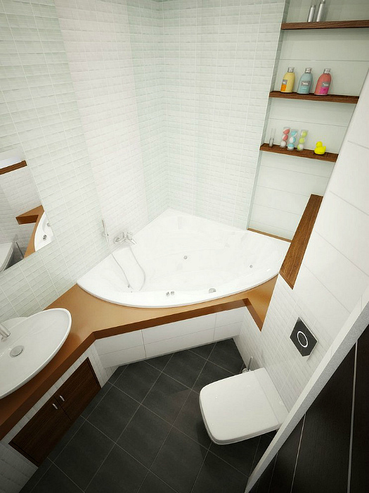 Ванная комната с необычными границами. | Фото: Моя Ванна.Маленькие санузлы - это фишка типовых построек 60-80-х годов. Однако скромный размер - не приговор. С помощью современных материалов и технологий можно самостоятельно скорректировать границы пространства. Взгляните, как оригинально и функционально дизайнеры обустроили эту ванную комнату, разместив в углу джакузи, обшивка которой плавно «перетекает» в шкафчик под мойкой и вплотную прилегает к стене. Остальные предметы обстановки имеют минималистичный дизайн, в таком же стиле подобрана и отделка.