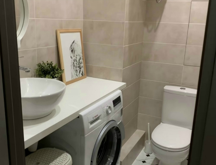 Стиральная машинка под столешницей. | Фото: Труд.На фото - прекрасный пример того, где и как можно разместить стиральную машинку. Дизайнеры убрали верхнюю крышку и установили машинку под столешницей. Если отдать предпочтение накладной раковине с компактным сифоном, рядом со стиральной машинкой еще останется место для вместительной корзины для белья.
