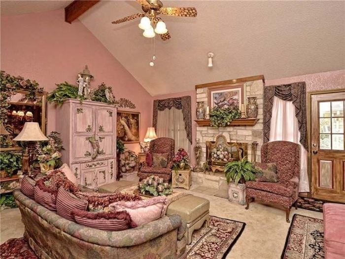 Несмотря на известное утверждение, что «о вкусах не спорят», бывают ситуации, когда даже большие поклонники всего зефирно-розового впадают в ступор от чрезмерного изобилия рюшей и бантиков. Именно такой странный во всех отношениях интерьер сейчас активно обсуждается на просторах интернета. Так, в Техасе выставлен на продажу обычный с виду дом, который и произвел настоящий всплеск эмоций. Что же так взбудоражило пользователей Сети? В Техасе обычный с виду дом наповал сразил откровенно странным интерьером. | Фото: awesomeinventions.com/ pro-remont.mediasalt.ru.Объявления о продаже недвижимости на страницах огромного количества интернет-площадок - настолько обыденное дело, что мало кто из незаинтересованных лиц обращает на них внимание. Но одно объявление вызвало настоящую бурю обсуждений пользователей Сети, которые никогда даже и не интересовались недвижимостью. Давайте разберемся, чем «прославился» ничем непримечательный на первый взгляд дом в Лейжервудсе, штат Техас. Вычурная гостиная вряд ли сможет вместить много гостей – все заполонили подушки, декор и цветы. | Фото: awesomeinventions.com.Внимание людей, которые ищут недвижимость, не могло не привлечь объявление со странной припиской: «На участке имеется древнее захоронение (перед домом)». Естественно любопытный народ не преминул заглянуть на страничку и пролистать выставленные фотографии, которые еще больше загнали в угол, ведь такого поворота уж точно никто не ожидал. Ну как обойтись в столовой без ламбрекенов, рюшей, оборок и обилия цветов? | Фото: awesomeinventions.com.Описание соответствовало фотографиям, и фасад дома вполне привычный для этих мест, и ухоженный двор с бассейном в глубине участка, и отдельный гараж, и большой плодоносящий сад. Но «переступив порог» все сразу же начинали понимать, что значили слова в объявлении: «Единственный в своем роде художественный дом, с множеством замечательных особенностей». Вторую гостиную оформляли с меньшим рвением, но без цветов все равно не обошлось. | Фото: lokmat.com.Даже романтическим натурам, которые обожествляют розовые тона, цветочки, ленточки, рюши и бантики, интерьер показался чрезмерно «зефирным» и перегруженным обилием всего перечисленного, а также наличием огромной массы статуэток, сувениров, подушек, картин и прочего декора, от которого кружилась голова. И это только глядя на фотографии, страшно представить себе человека, который внезапно попадет в столь странные и совсем несвойственные для большинства жителей планеты хоромы. В дизайне кухни преобладают милые зайчики на полянках, «досталось» даже холодильнику, столешницам, плафонам и мебели. | Фото: awesomeinventions.com.Помимо обилия всех оттенков розового цвета – обои, текстиль, ковры и даже мебель имеют цветочный рисунок или леопардовый мотив, а перегруженность декоративными подушками сводит на нет функциональность диванов, ведь присесть уже попросту негде. Непонятное для большинства украшательство в стиле декупаж можно увидеть не только на фасадах шкафов и комодов. Расписная кухня с кисточками на ручках кухонного гарнитура даже для любителей всего экзотического – уже перебор. | Фото: awesomeinventions.com.Сказочно-цветочные мотивы в зефирно-розовых тонах украшают всю бытовую технику, столешницы, фасады кухонного гарнитура и текстиль. Исключением стала лишь посудомоечная машина, которая чудом осталась нетро