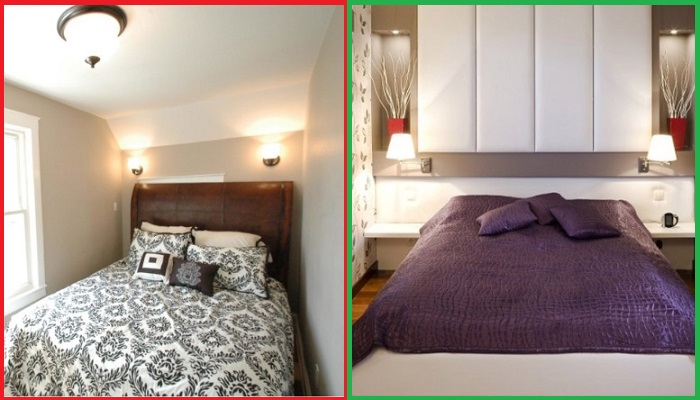Между кроватью и стенами должно оставаться свободное место, например, для тумбДаже дизайнеры признают, что правильно подобрать большую кровать для маленькой спальни, не заняв все место, и не превратив комнату в подобие гостиничного номера, достаточно сложно. Органично будет смотреться кровать, расположившаяся в узкой нише, однако в этом случае могут возникнуть неудобства с наведением порядка и необходимость залезать на нее со стороны изножья. Также очень важно учесть грамотное расположение других деталей.• Откажитесь от прикроватных тумбочек, расположенных по бокам от кровати. Они занимают ценные квадратные метры, утяжеляют интерьер и практически не увеличивают пространство для хранения. Более удачным вариантом станет размещение полки над изголовьем. Если под кроватью есть пустое пространство или встроенные ящики, их также можно задействовать для хранения нужных вещей, например, постельных принадлежностей.• Не вешайте в спальне телевизор. Спальня – это место для отдыха и расслабления. А, как известно, синий свет, излучаемый телевизором, ухудшает выработку мелатонина и портит сон. Лучше повесьте над изголовьем светильник и посвящайте последний час перед сном чтению.• Расположите карниз для штор чуть выше окна – так оно визуально будет казаться больше.