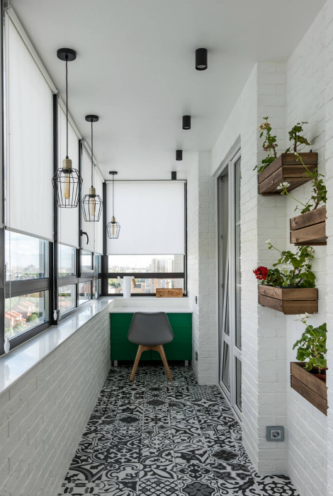 Микс цветов, узоров и фактур. | Фото: Houzz.Этот балкон - прекрасный пример грамотного сочетания нескольких цветов и фактур. Имитация кирпичной кладки на стенах выгодно контрастирует с черно-белыми узорами напольной плитки, а цветы в оригинальных деревянных кадках и письменный столик насыщенного зеленого цвета создают динамику.В продолжение темы: 5 улётных идей для оформления балкона, которые не потребуют трат и дорогой мебели.
