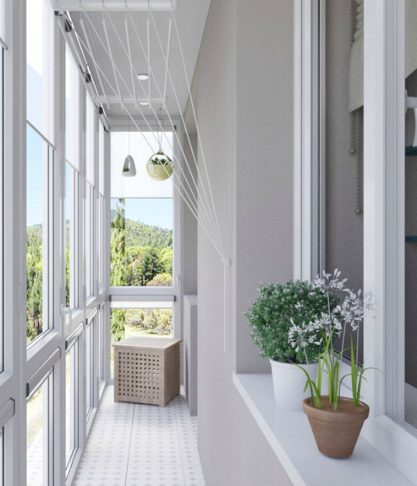 Узкий балкон в минималистичном стиле. | Фото: Pinterest.Светлая узкая лоджия в лучших традициях минималистичного, скандинавского и монохромного стилей. Здесь нет никакой громоздкой мебели, только легкие стеллажи, много цветочных горшков и гирлянды-фонарики.