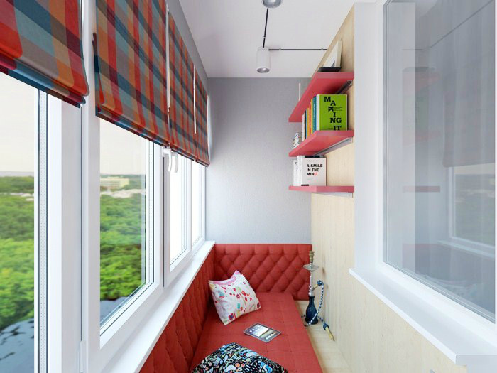 Лоджия с большим диваном. | Фото: MoyDomik.net.Узкая лоджия, все пространство которой занимает большой красный диван с красивой стеганой спинкой, - идеальное место для шумных посиделок и уединенного отдыха. Обратите внимание, что диван установлен спинкой к подоконнику, что очень эргономично в случае с узкими помещениями.