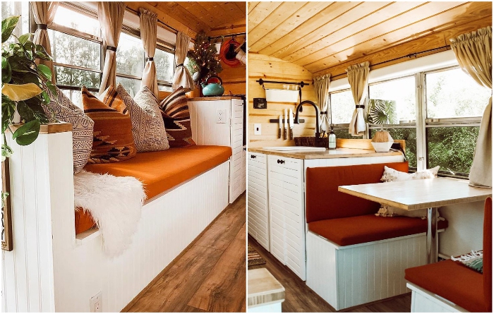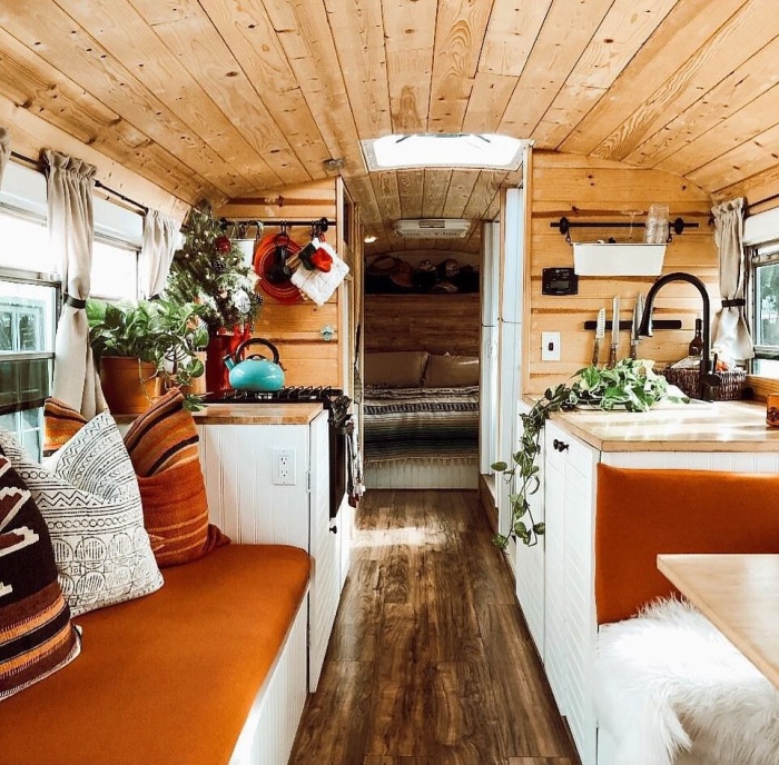 Столовая-гостиная может вместить не только хозяев, но и гостей («One Wild Ride»). | Фото: domino.com/ dailymail.co.uk.Для того, чтобы автобус можно было использовать как полноценное жилье для постоянного проживания, им пришлось полностью избавиться от кресел, старой внутренней обшивки и тщательно утеплить «фасад» автобуса. А чтобы внутри чувствовалась более домашняя обстановка, в качестве отделочных материалов выбрали натуральное дерево, которое можно увидеть и на полу, и на потолке, и в качестве панелей.