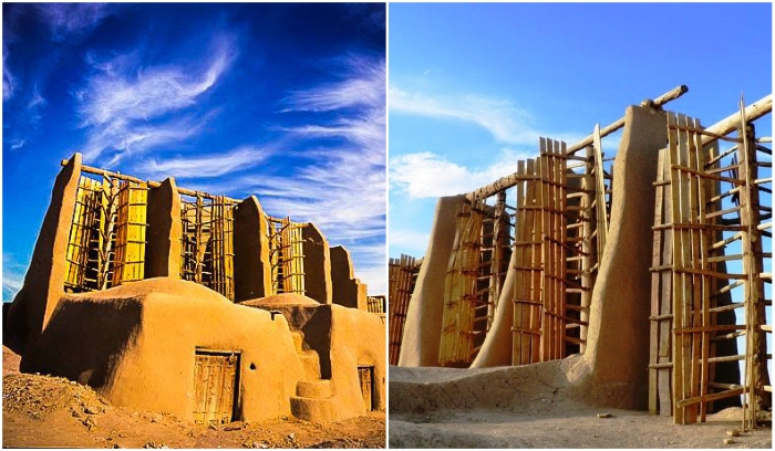 Древние ветряные мельницы Ирана созданы из глины, соломы и древесины (Nashtifan). | Фото: amusingplanet.com/ pinterest.com.Эти сооружения отличаются от более современных мельниц своей конструкцией. Персы придумали механизм, состоящий из 8 вращающихся камер, которые имеют 6-12 вертикальных лопастей в виде парусов, покрытых тростниковой циновкой или тканью. Сила ветра заставляет двигаться лопасти, приводя в действие вал, соединенный с каменными зернодробилками, которые и перетирают зерно. Непривычное для современного человека сооружение, больше похожее на стены с прорезями высотой 15-20 м, имеет довольно оригинальный внешний вид.