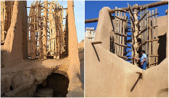 Принцип работы ветряных мельниц Ирана, примитивные механизмы которых работают уже полтора тысячелетия (Nashtifan). | Фото: pinterest.com.Также остается загадкой, как сооружение, созданное из глины, соломы и дерева может столько сохраняться в первозданном виде и еще активно эксплуатироваться. Даже несмотря на то, что подобная конструкция оказалась менее эффективной, чем последующие модели мельниц с вертикальным расположением ветровых лопастей.