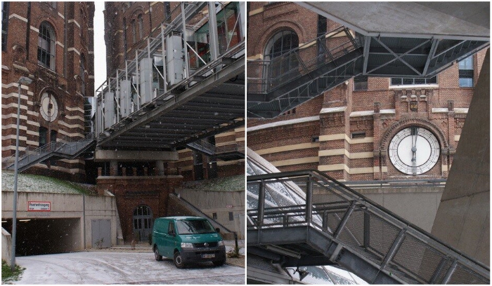 Воздушные мосты и различные переходы обеспечивают комфортное сообщение между корпусами (Венские газгольдеры, Австрия). | Фото: 22sobaki.livejournal.com.Для удобства передвижения между резервуарами-корпусами на уровне развлекательной и деловой зоны создали дополнительные воздушные мосты и переходы, которые обеспечивают сообщение между разными объектами. Так что на улицу выходить и вовсе не придется. Единственное исключение составляет верхний уровень, где расположены жилые апартаменты и резиденции. Сюда праздношатающиеся попасть никак не смогут, ведь вход открыт только для жильцов, обслуживающих компаний, служб доставки и приглашенных гостей.