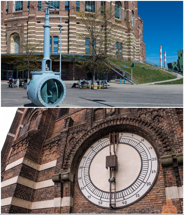 Водонапорная башня – ровесница газгольдеров (Вена, Австрия). | Фото: one-in.livejournal.com.Под стать этим 4 гигантам рядом находятся и другие здания. До наших дней хорошо сохранилась и водонапорная башня, которая в свое время поставляла воду для резервуаров газометров, и станция управления резервуарами. Теперь этот инженерный ансамбль, который почти 100 лет обеспечивал жителей Вены благами цивилизации, был полностью трансформирован.